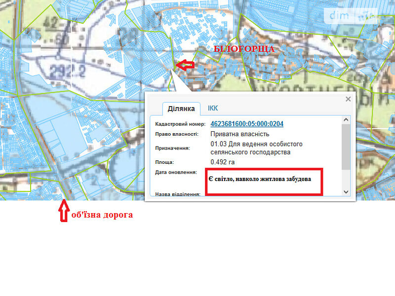 Ділянка знаходиться в мікрорайоні *Білогорща*, має рівнинну площину, недалеко від об'їзної дороги, або заїзд з району Левандівки. Навколо житлова забудова. Згідно генерального плану земельна ділянка розміщена на землях житлової забудови в межах населеного пункту.