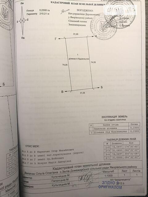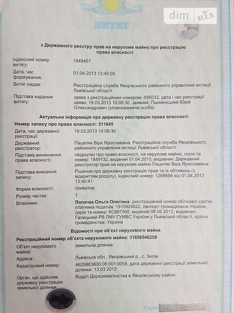 Земельна ділянка під будівництво, від власника у с. Зелів, Яворівського р-ну. Є електрика. 23 сотки, прямокутної форми. 50 м від основної дороги, 18 км. від Львова. Геолокація 49. 9066170, 23. 8555389 Тел +380 (95) 260 03 00 Юрій (чоловік) ----------------- ПЛОЩА ДІЛЯНКИ: - одиниця виміру: сотка ЦІНА: - ціна: 10000 - тип валюти: $ - тип ціни: за ділянку - тип пропозиції: від власника КАДАСТР: - Кадастровий номер: 4625883600:06:001:0058 КОМУНІКАЦІЇ: - електрика: можливе проведення - газ: є можливість підведення - каналізація: немає НА ТЕРИТОРІЇ Є: - вихід до водоймища: 1-ша лінія (з безпосереднім виходом) - персональна водойма: немає - паркан: немає - з фундаментом: так ХАРАКТЕРИСТИКА ДІЛЯНКИ: - розміщення ділянки: в селі - рельєф: рівнинний - грунт: не вказано ІНШЕ: - право власності на землю: приватне (держ.акт приватизації) - документи на право власності: свідоцтво про право власності - під будівництво будинку: так