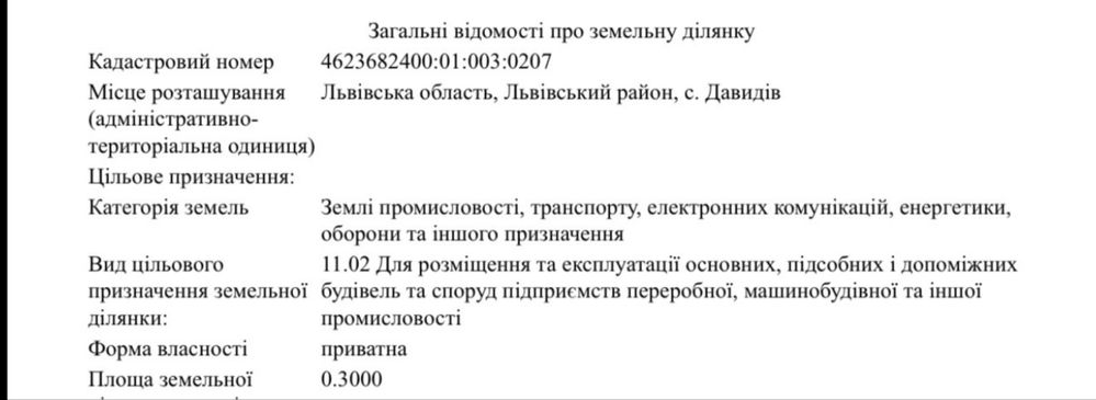 Продам ділянку в дуже хороші та перспективній локації. с.Давидів Площа 0,30 га Поруч проходить активна забудова складів та комерції. Ділянка розташована поруч з АЗС. Переведенна в комерційне призначення: 11.02 Для розміщення та експлуатації основних, підсобних і допоміжних будівель та споруд підприємств переробної, машинобудівної та іншої промисловості. Кадастровий номер: 4623682400:01:003:0207 Є містобуди на будівництво складу. Продаж не терміновий Ціна за сотку 8000 тис.дол