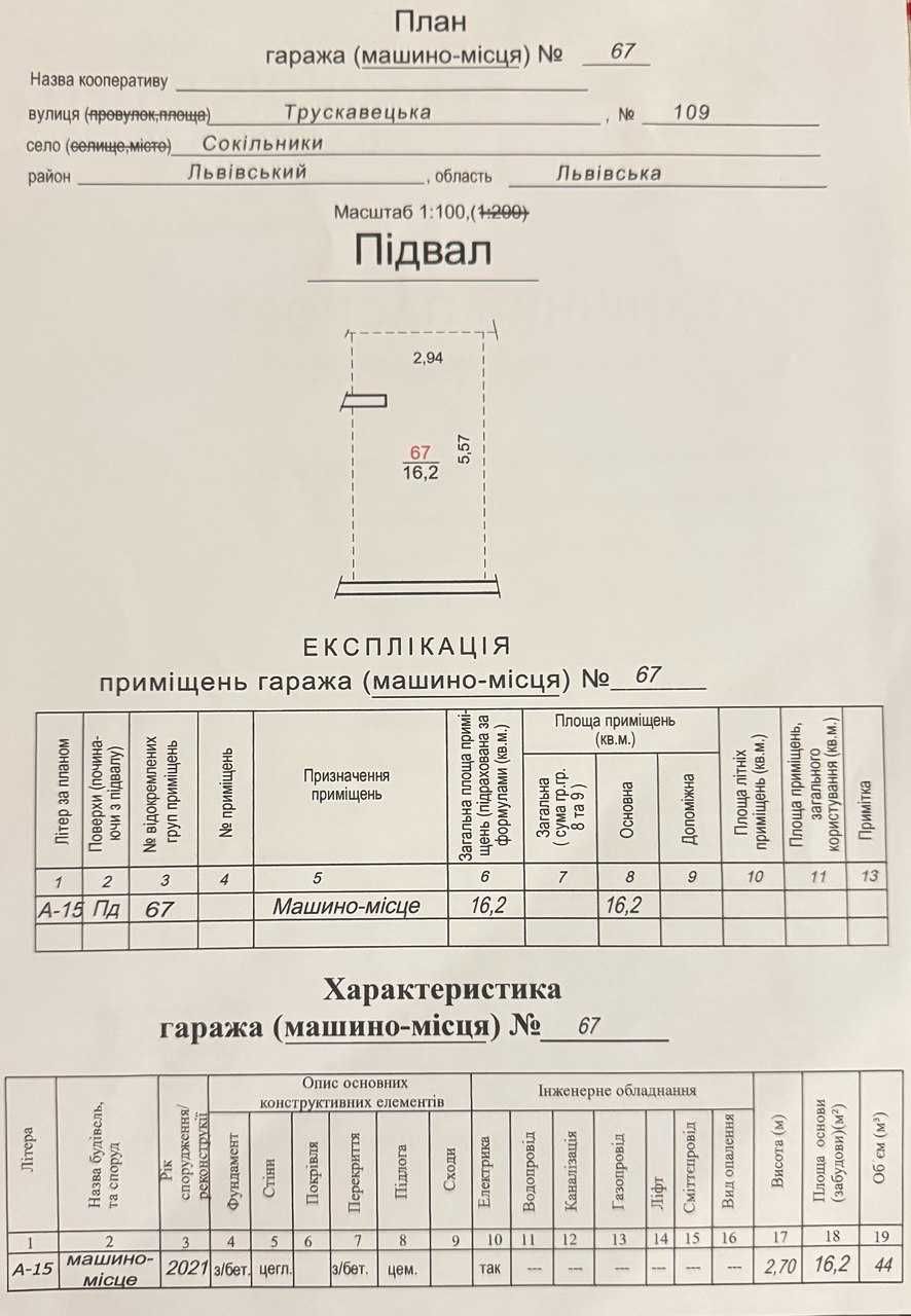 Продаж ПАРКОМІСЦЯ в ЖК "ГалЖитлоБуд" Львівська обл., с.Сокільники, вул. Трускавецька 109, будинок-Б 16,2 м² ( паркомісце 67), ширина 2,94м, довжина 5,57м ВИГІДНА ПРОПОЗИЦІЯ В ЗДАНОМУ БУДИНКУ! Підземний паркінг Бетонні стіни, хороша вентиляція ! Є право власності. В паркінгу встановлено Wi-Fi, в разі перебування в паркінгу під час тривоги тепер є можливість користуватися безоплатним інтернетом. Ідеально підійде як для власного авто, так і для інвестиції під оренду! Тиха, спокійна локація. Розвинена інфраструктура. До центру міста - 20 хв на авто!