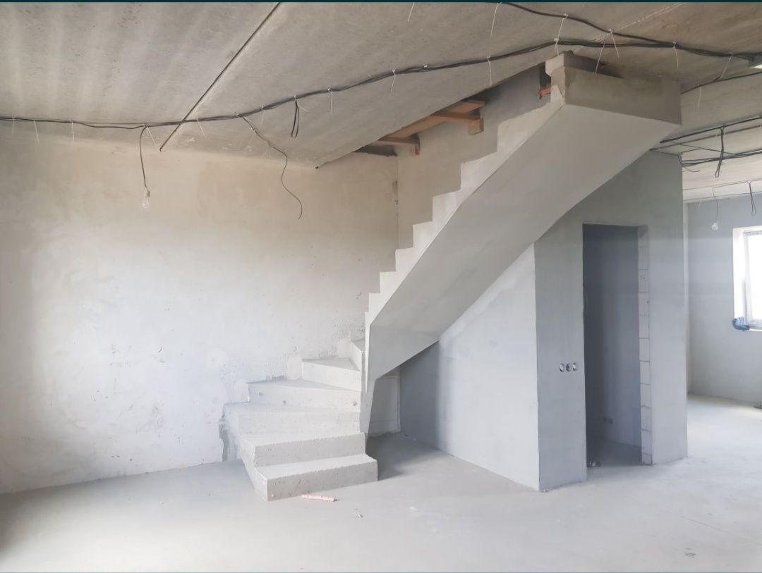Продаж квартири дворівнева. 103 м.кв. Зроблена чорнова електрика, встановлений електрощиток, зроблена розводка каналізації, води по квартирі,встановлено 2 інсталяції, рушникосушка, душовий трап, тепла підлога + батареї, залита стяжка, частково пошпакльовано, додатково утеплено потолок другого поверху, залиті заліщобетонні сходи.