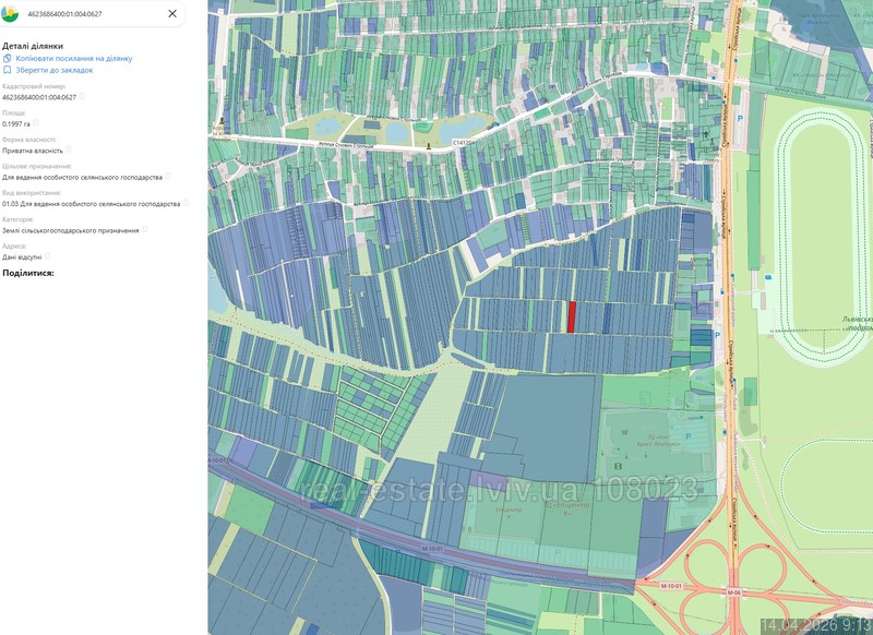 Земельна ділянка Сокільники. Призначення: для ведення особистого селянського господарства. Площа 0.1997 га.
